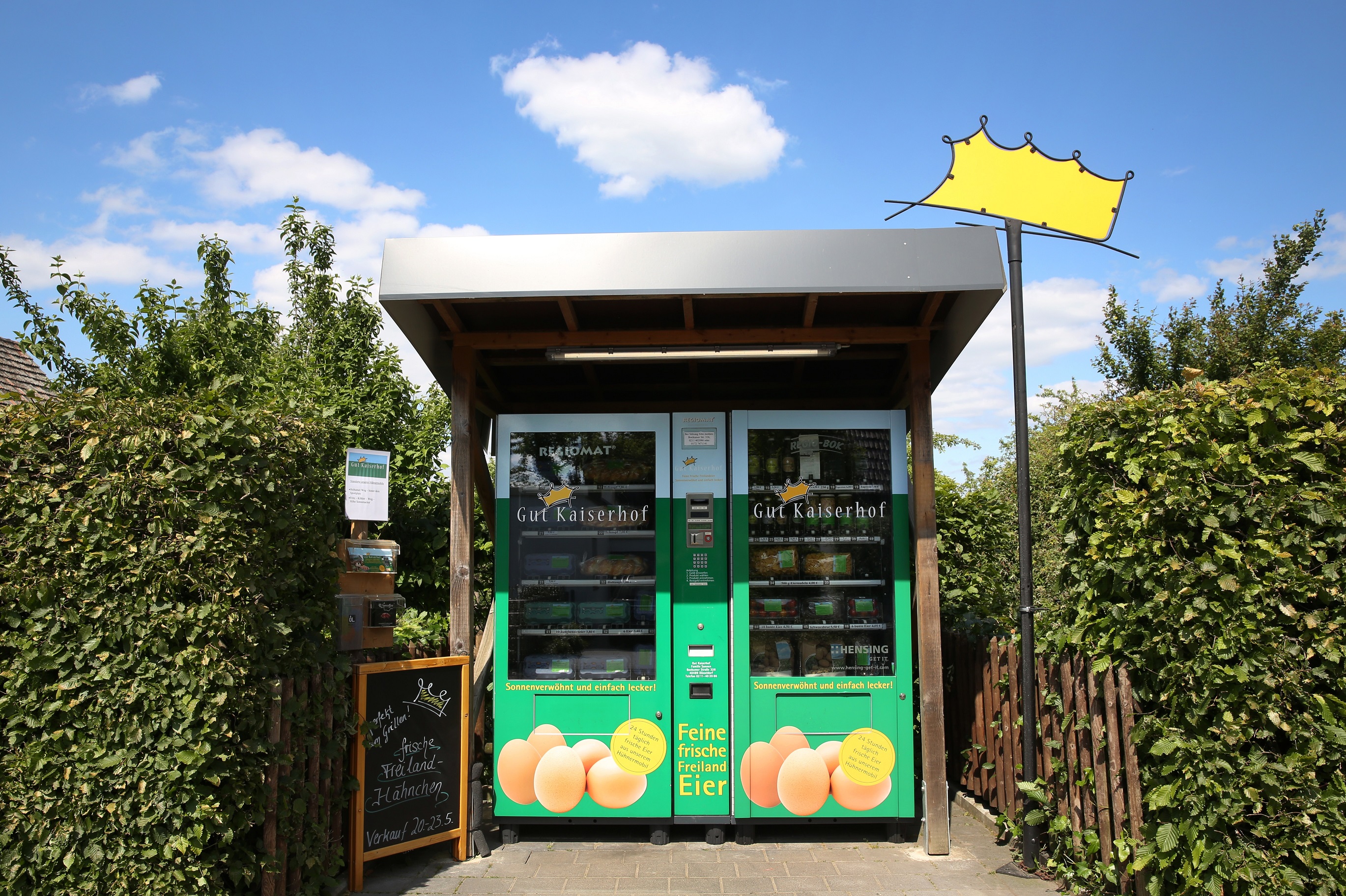 In unserem Verkaufsautomaten am Hof erhalten Sie rund um die Uhr: täglich frische Freilandeier aus unseren Hühnermobilen, gekochte und gefärbte Freilandeier aus unseren Hühnermobilen, Nudeln hergestellt aus unseren eigenen Eiern, selbstgebackenes Schwarzbrot, selbstgebackene Hefezöpfe, festkochende Kartoffeln aus der Region, Kaffee- und Espressobohnen von Rivercoffee und kaltgepresste Raps-, Lein-, Leindotter- und Kürbiskernöle von der Ölmühle Hof Becker. Selbsthergestellter Eierlikör, Suppenhühner aus unseren Hühnermobilen, Freilandhähnchen aus unserem Hähnchenmobil und individuell zusammengestellte Geschenkkörbe bekommen sie ab Hof - bitte klingeln bzw. ggfs. Ihren Besuch vorher telefonisch ankündigen.