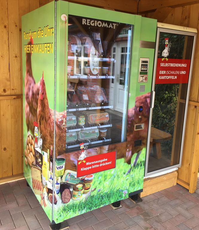 Zusätzlich zu unserem Hofladen können Produkte aus der eigenen Erzeugung an unserem rund um die Uhr geöffneten Verkaufsautomaten gekauft werden. Hier gibt es z.B. frische Eier, Kartoffeln, Honig sowie Gefügel, Wild und Wurstwaren.