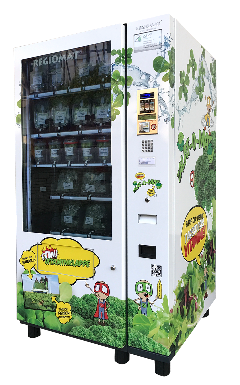 Seit November 2016 stehen Zalat-o-maten 24 Stunden, 7 Tage die Woche für Sie bereit! Zapfen Sie sich Ihre Tagesdosis Vitamine in Form von Pflücksalat, Obst, Brokkoli, Zucchini und vielem mehr aus einem unserer Zalat-o-maten.